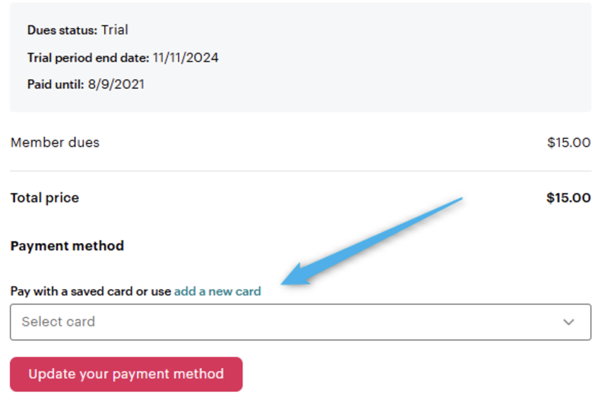On the checkout page, choose an existing card or select Pay dues/Set up payment to add a new one and complete payment